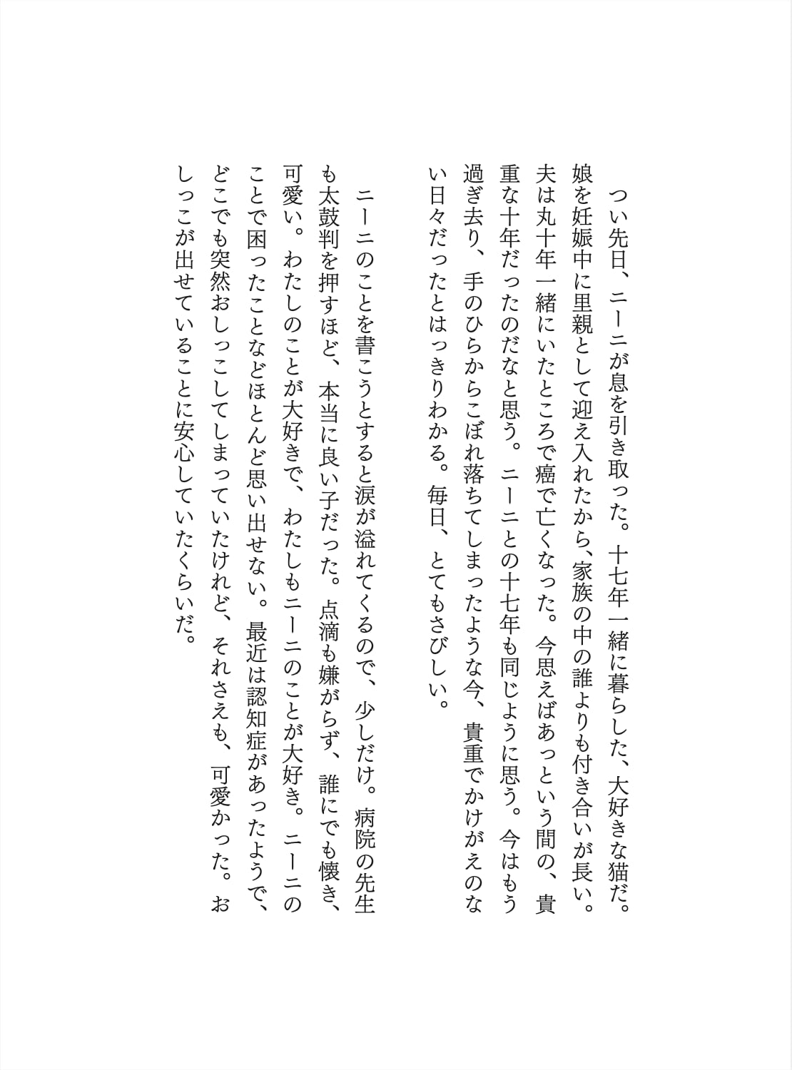 17年一緒に暮らした猫、ニーニが息を引き取りました。そのときのきもちは書かなければいつか忘れてなくなってしまう。空白を埋めるように、いなくなって3日後に書き上げたエッセイ「それがさびしい」。できることなら、もう一度ニーニに会いたいです。